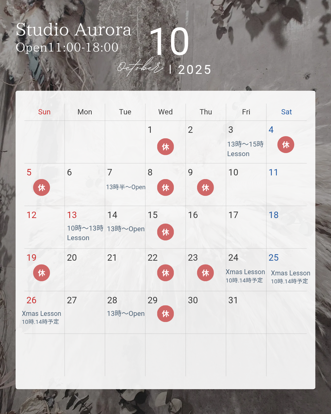 StudioAuroraではお客様のご希望にあわせたフリーレッスン、季節のワークショップも開催しています。